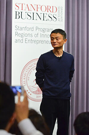 Less than two minutes into his talk at the event co-hosted by Alibaba Group and the Stanford Program on Regions of Innovation and Entrepreneurship (SPRIE) of the Stanford Graduate School of Business, Ma touched on the trials and travails he had faced early on as an internet and e-commerce pioneer in China. "Back in 1995," revealed Ma, "I felt I was a loner and people thought I was a cheater. They said I was trying to make something out of nothing.” In fact, added Ma, his first interview with CCTV was censored at the behest of the producer, who feared Ma's talk about giving the Chinese government internet access was "not a positive influence" and made Ma "look like a bad guy."